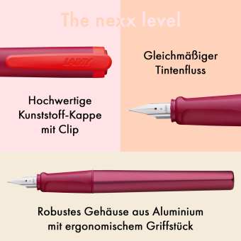 Sehr gut geeignet als Anfängergerät. Der LAMY nexx M Füllhalter hat ein weiches und rutschfestes Griffstück für ein langes und ermüdungsfreies Schreiben.Seine polierte Edelstahlfeder macht das Schreiben super leicht.