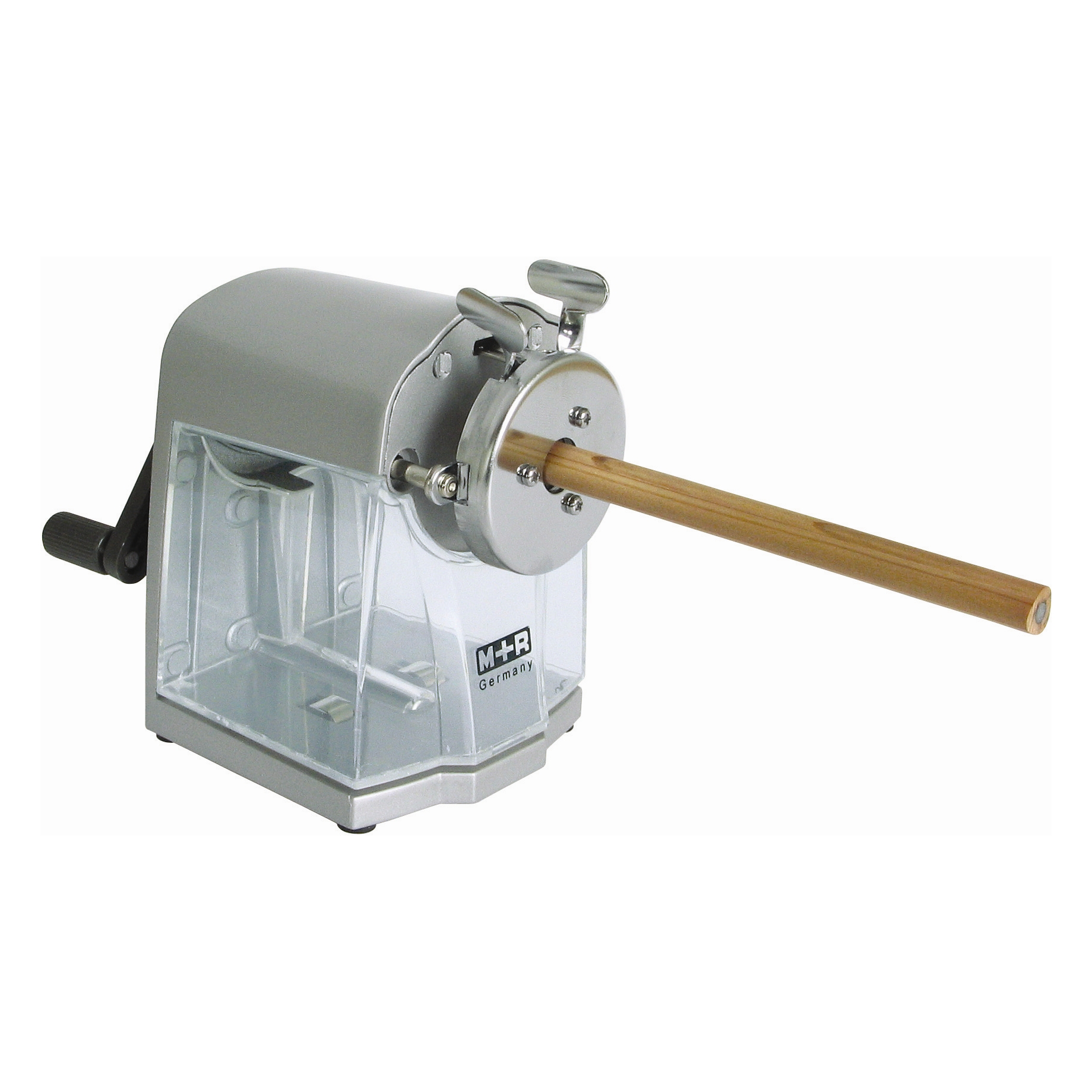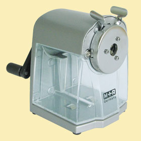 Kurbel-Spitzmaschine für Blei- und Farbstifte bis ca. 11.2 mm Durchmesser. Qualitäts-Fräser. transparenter Spanbehälter. hochwertiges. massives Druckgussgehäuse. Lange Spitze für Bleistift und kurze Spitze für Farbstifte einstellbar. Großer Spanbehälter.